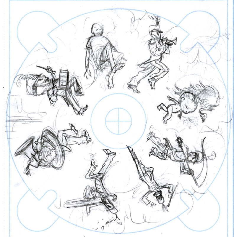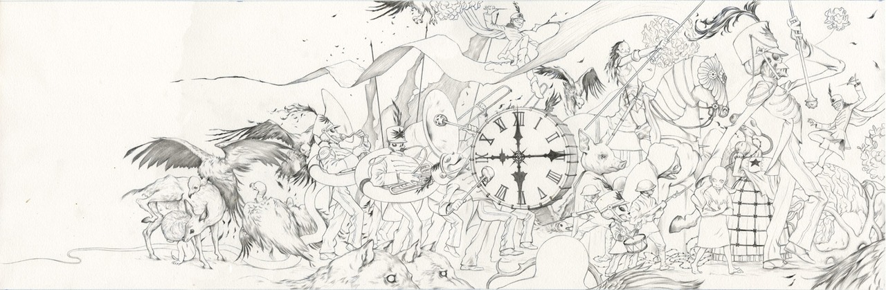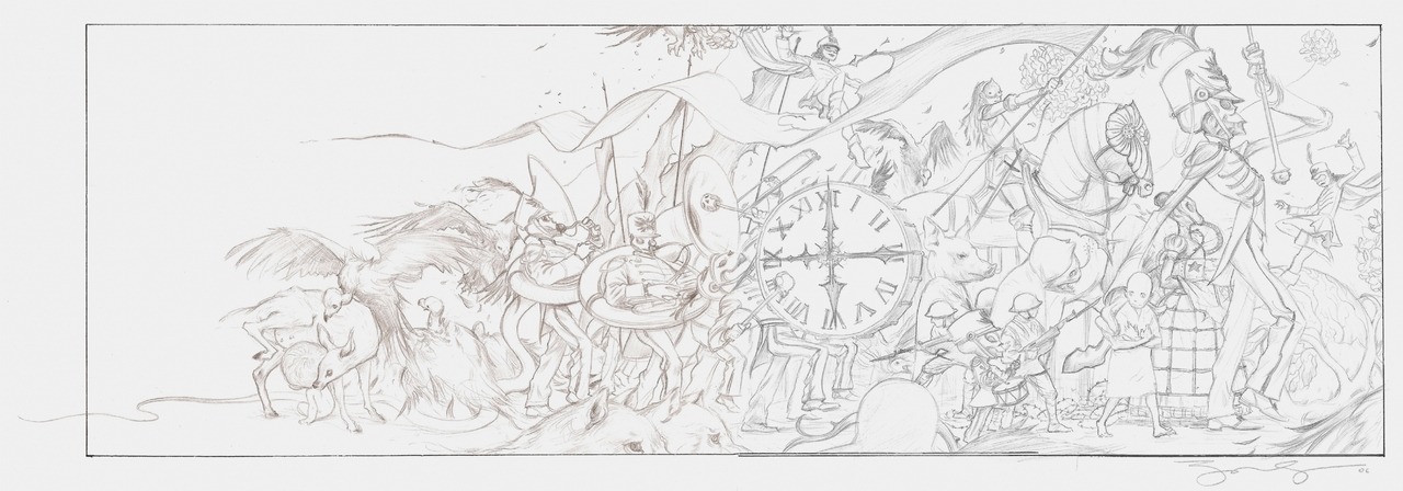 This is the final line drawing for the My Chemical Romance (MCR) Black Parade Album Cover – Gatefold. The piece is 10.5 x 32", drawn with graphite on Rives BFK. A lot of James’ work borders on the surreal and possesses a near-nightmarish quality. And strangely, it is so jaw-dropping beautiful. This piece is no exception. Take note of the flow, attention to detail, and a story unfolding as your eyes scan the drawing left to right. The MCR Black Parade Limited Edition version which presents James’ work received a 2008 Grammy nomination for Best Boxed Or Special Limited Edition Package.